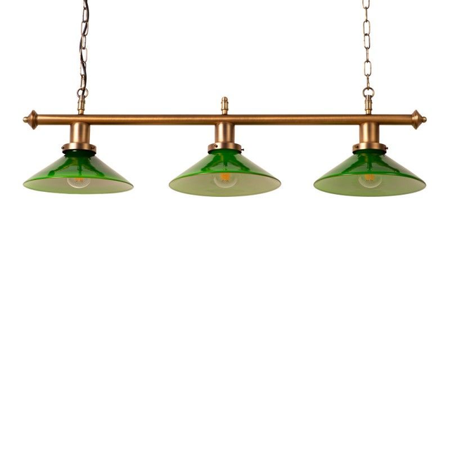 Lampe suspendue vintage "BANQUEVERDE", avec trois abat-jour et un élégant support en laiton antique.